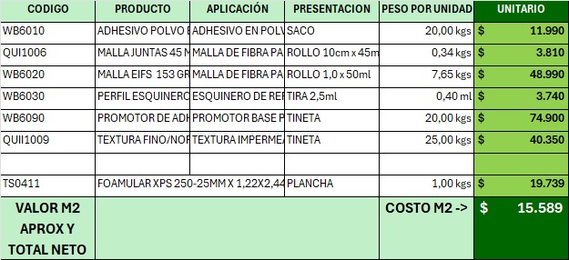 Aquí es donde debes mencionar o anunciar que tenemos PRECIOS ESPECIALES por M2 de sistema eifs. y abajo que aparezcan los 4 "productos" que comentamos recién por wsp. Cada uno con su precio por m2.