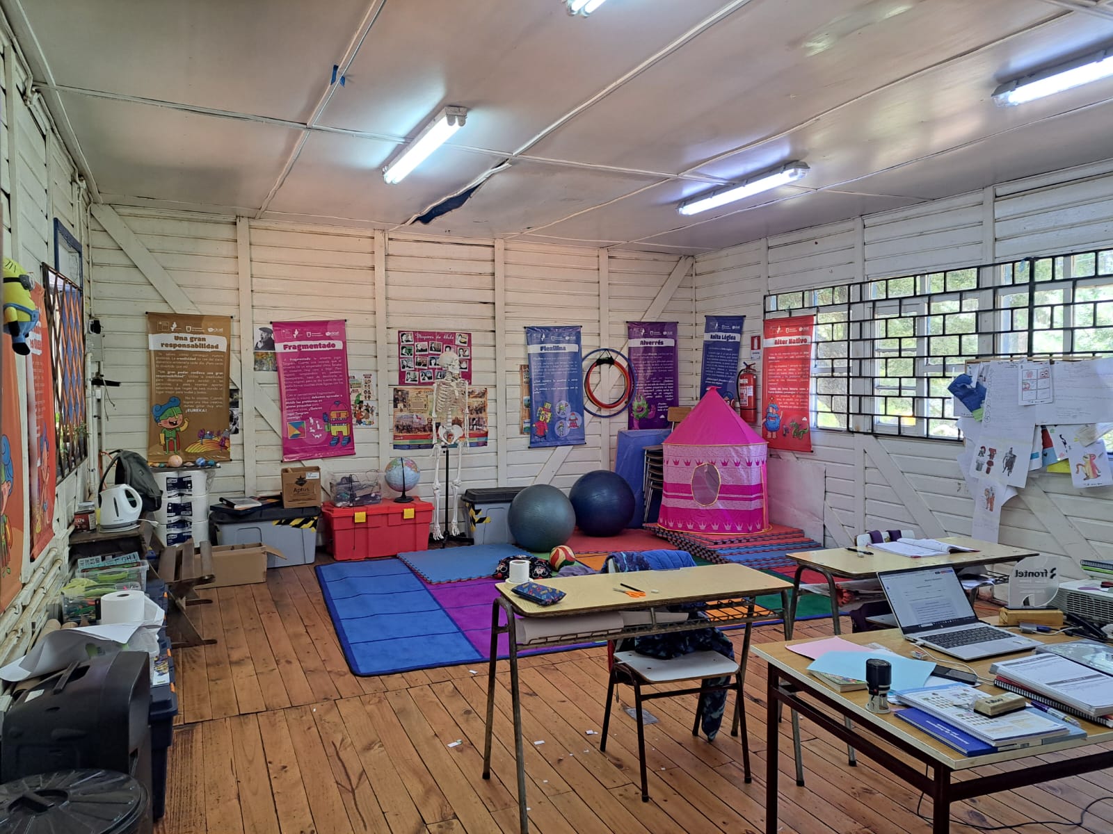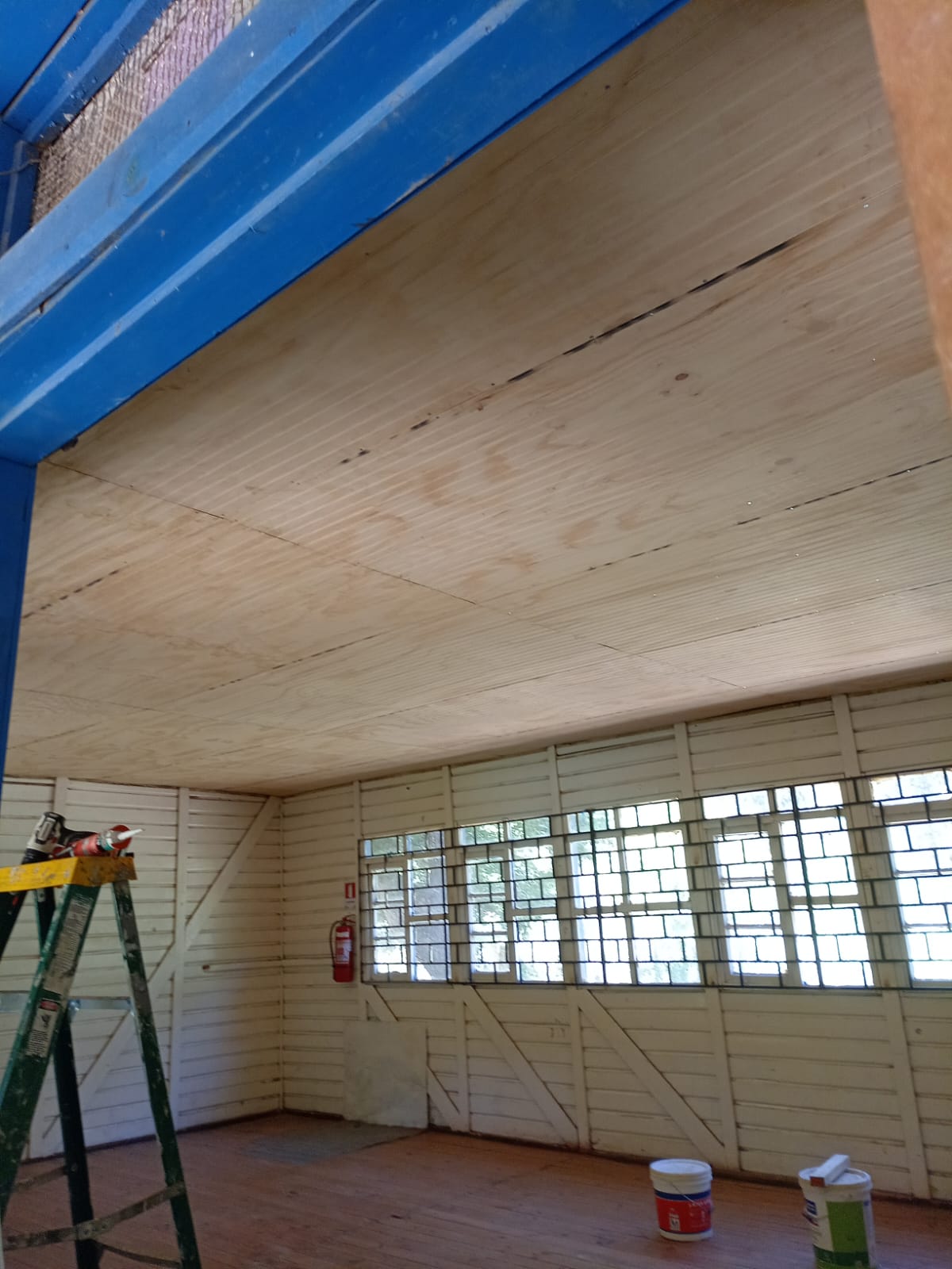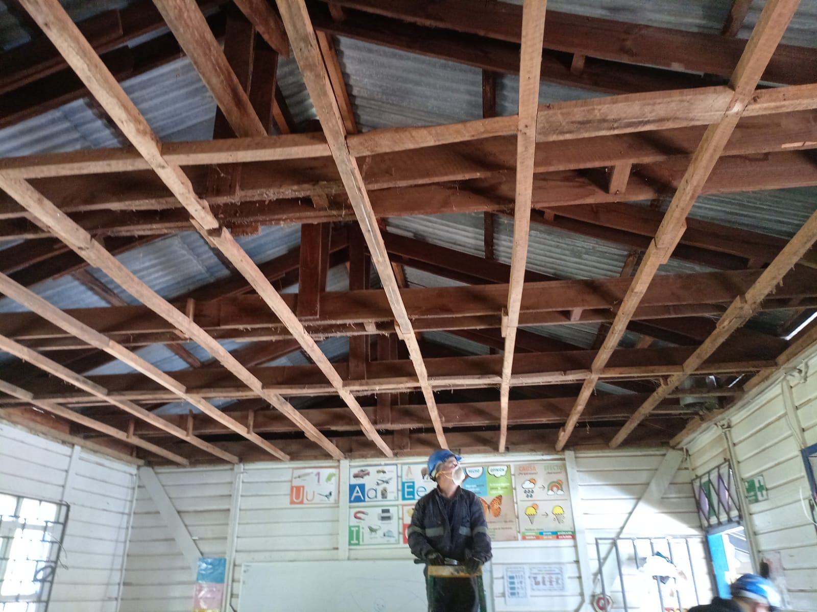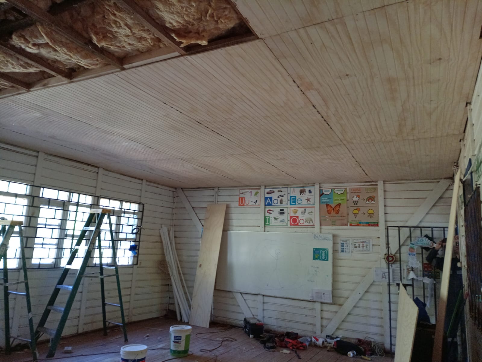 Nuestra intervención se centró en optimizar la infraestructura térmica y estética del aula de clases. El trabajo consistió en el retiro de materiales deteriorados, refuerzo y la instalación de terciado ranurado para brindar un acabado rústico y acogedor. Además, implementamos aislación con lana de vidrio en toda la superficie, asegurando una mayor eficiencia energética y confort para los alumnos.